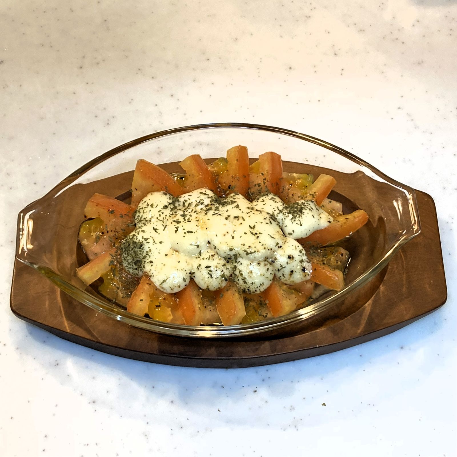 チーズは最初から入れず、トマトに火が通ってから加えると、溶けすぎを防げます